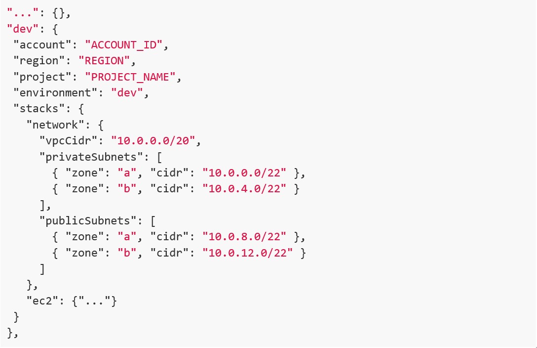 Partendo dal file “cdk.json”, qui il campo di interesse è il cosiddetto “context”. Al suo interno definiamo un contesto per ogni ambiente in cui vogliamo effettuare un deploy, nel nostro caso li abbiamo chiamati “dev” e “prod”. Qui definiamo quante più variabili ci possono servire, tenendo conto che se rendiamo il file troppo complesso, risulterà anche più difficile da leggere e da mantenere.