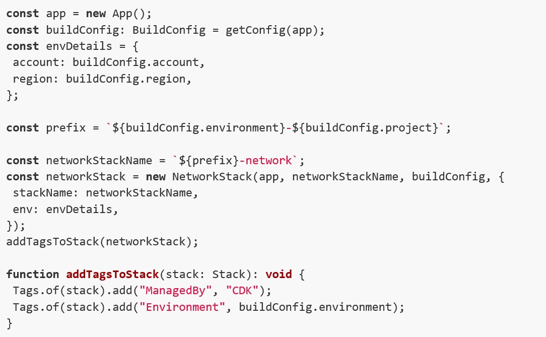 Creiamo anche la costante “envDetails” che viene passata ad ogni stack istanziato, per fornire le informazioni su che account e regione AWS tale stack sarà creato.