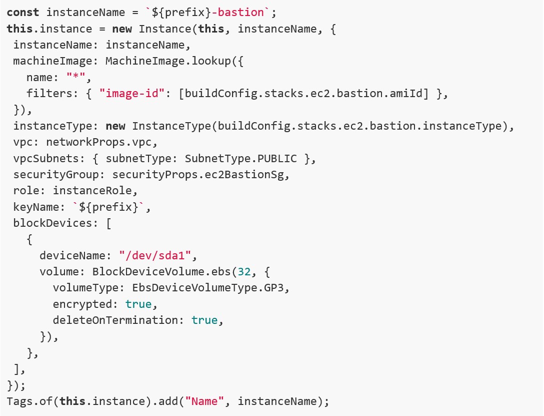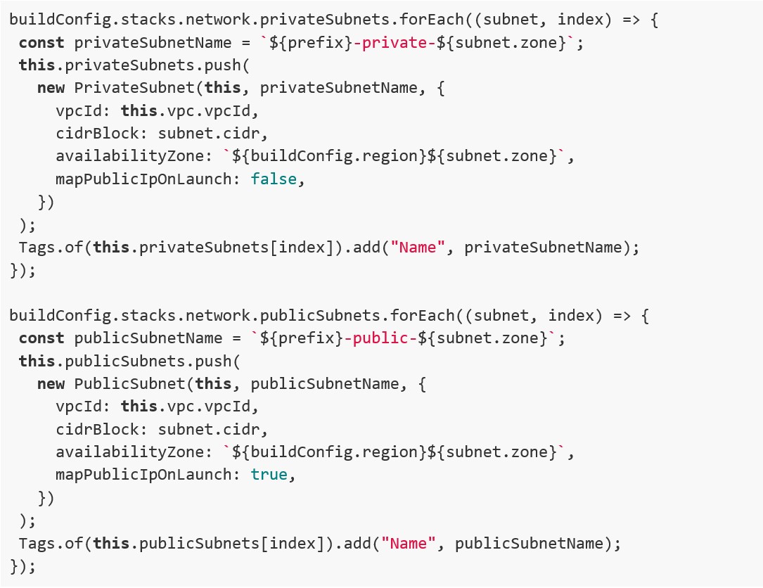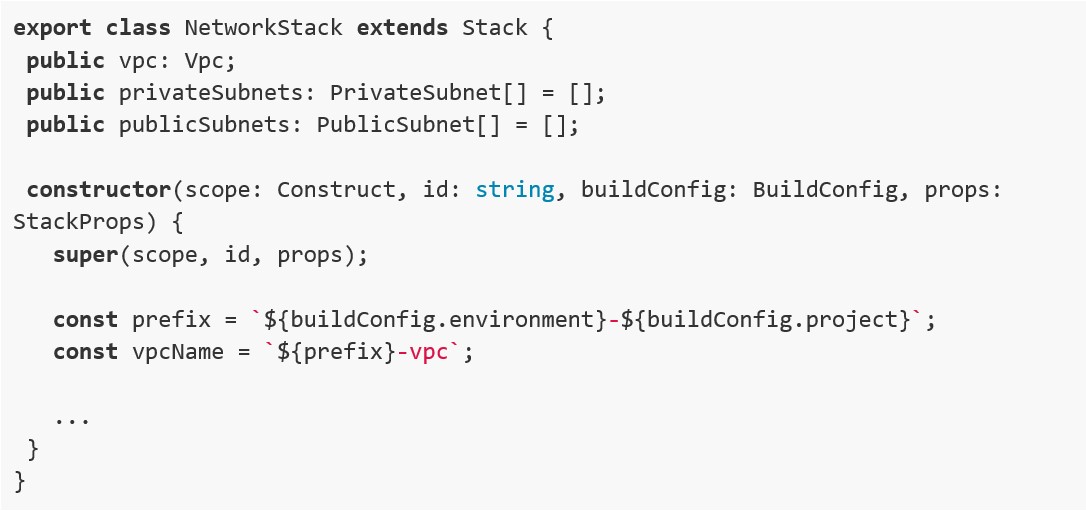 Ogni stack è una classe TypeScript che estendiamo per definire le proprietà di interesse. Tutte le proprietà che vogliamo esporre agli stack che importeranno questo stesso stack, le dichiariamo come “public” e saranno accessibili come campi dell’oggetto, quindi ad esempio “networkStack.vpc” oppure “networkStack.privateSubnets”.