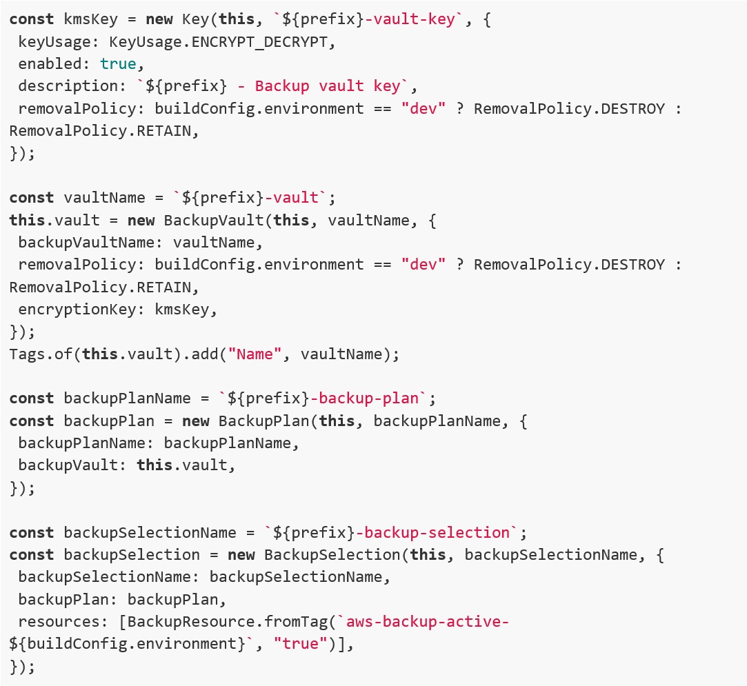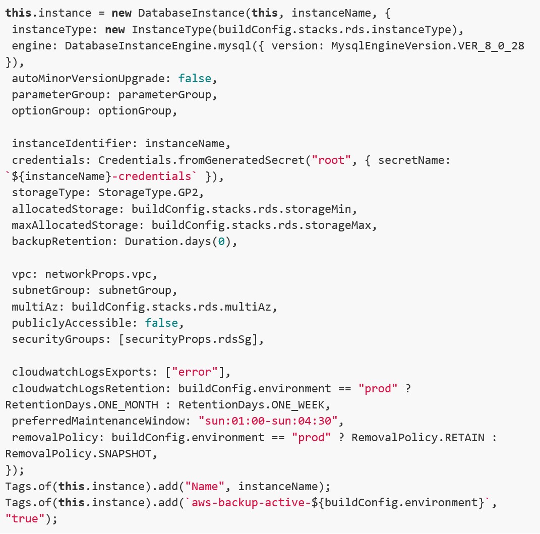 Per il database il costrutto dipende dal tipo di engine scelto (esempio MySQL o PostgreSQL) e dalla scelta tra istanza RDS o cluster Aurora, quindi alcune modifiche lato codice sono possibili se si vogliono cambiare queste configurazioni. In questo caso creiamo un’istanza singola di RDS MySQL, con autoscaling dello storage definito tramite parametri del “cdk.json”. Da notare come vengono disabilitati i backup automatici di RDS impostando “backupRetention: Duration.days(0)” perché aggiungiamo il tag apposito che abbiamo previsto per la selezione di AWS Backup, in modo da non avere un costo doppio per lo storage dei backup stessi.