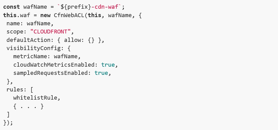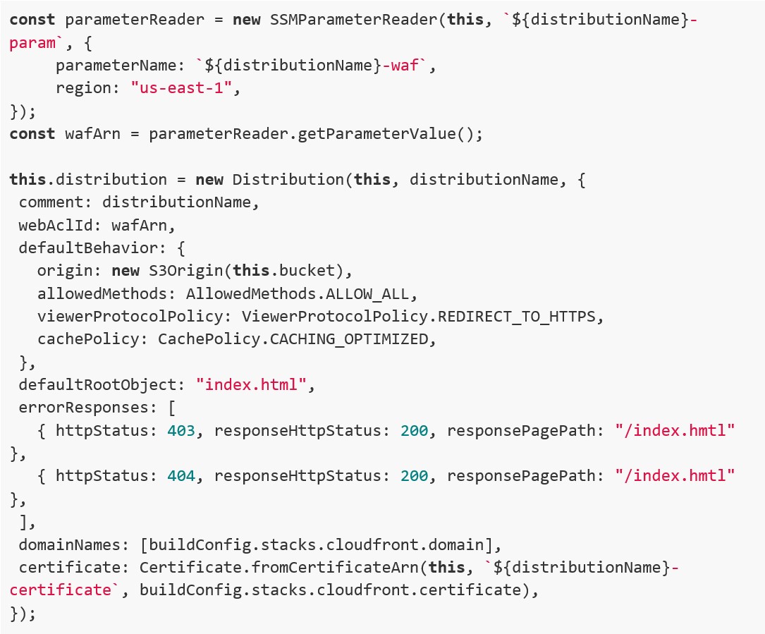 Per rendere il sito più sicuro agganciamo un WAF, il servizio di firewall di AWS, che essendo un servizio globale sarà deployato sulla regione Nord Virginia. Per recuperare l’arn in maniera automatica, utilizziamo l’oggetto “parameterReader” definito nella cartella “common” che eseguirà una chiamata API.